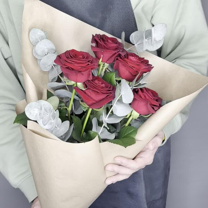 Лента атласная – 1 шт.Упаковка дизайнерская – 1 шт.Роза одноголовая россия – 5 шт.