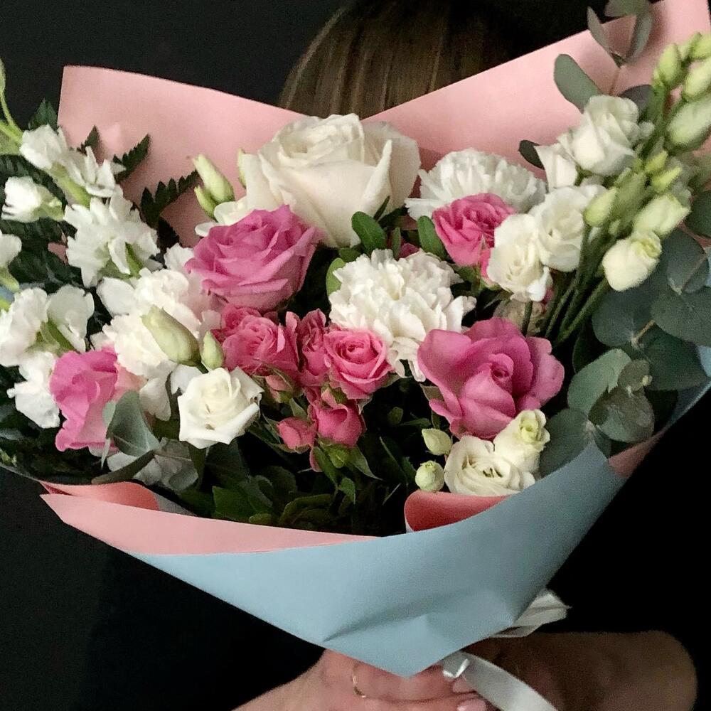 Маттиола – 2 шт.Роза кустовая – 2 шт.Эвкалипт – 2 шт.Роза – 3 шт.Диантус – 3 шт.Фисташка – 3 шт.эустома белая – 2 шт.Эквадор роза – 1 шт.Дизайнерская упаковка – 2 шт.