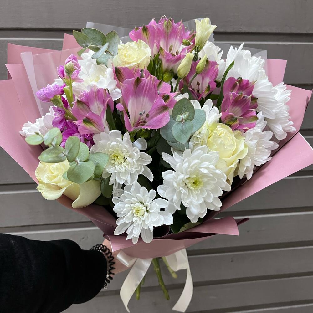 Хризантема кустовая – 3 шт.Роза – 3 шт.Альстромерия – 3 шт.Эвкалипт – 2 шт.Эустома – 2 шт.Маттиола – 1 шт.Оформление – 1 шт.