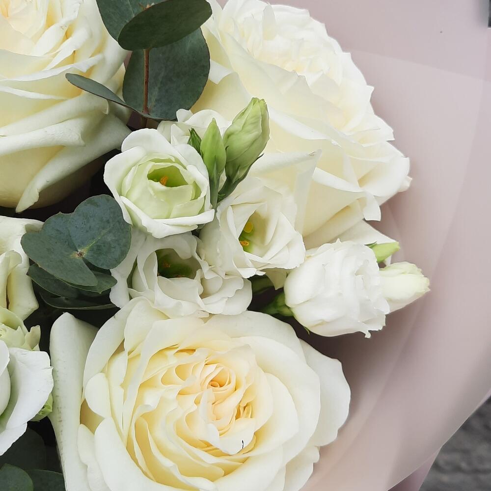 роза кендилайт – 5 шт.эустома белая – 2 шт.Эвкалипт – 1 шт.Упаковка – 1 шт.
