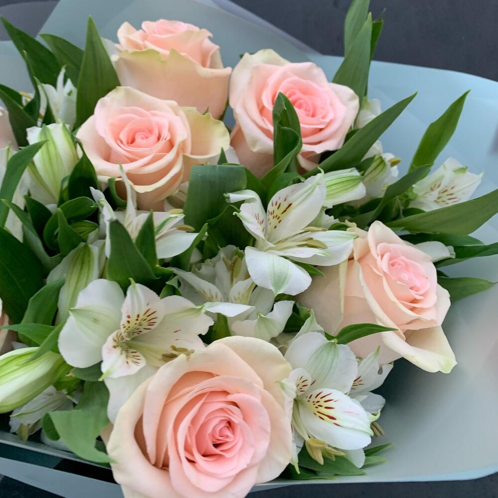 Букет из розовых роз, альстромерии и зелени «Матильда»