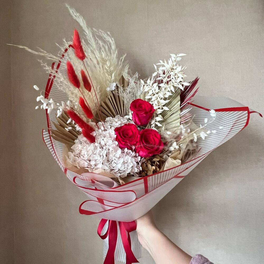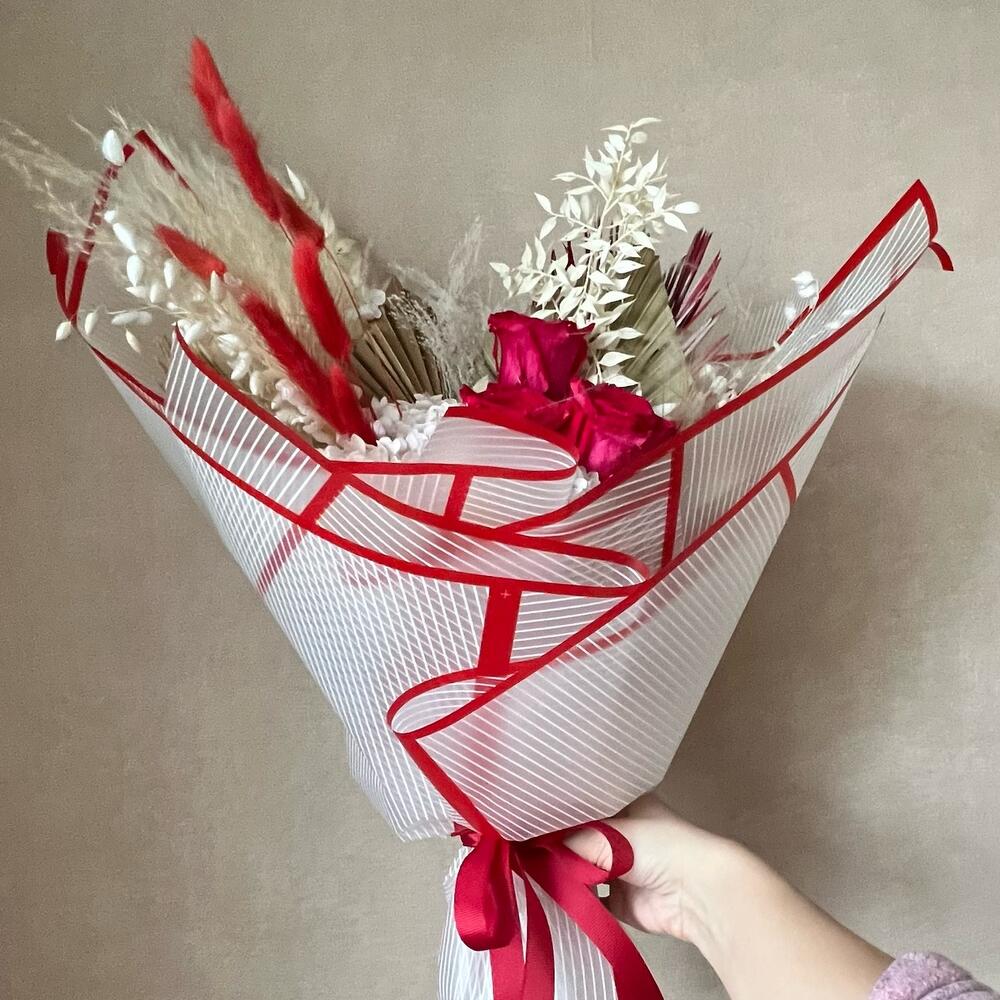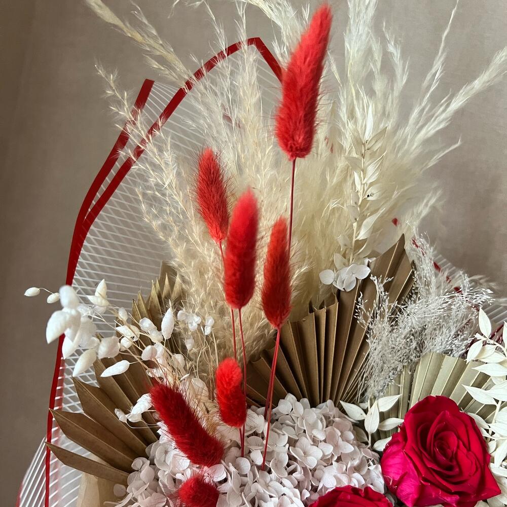 роза стабилизированная красная – 3 шт.кортадерия ( бежевая ) – 1 шт.кортадерия выбеленная – 1 шт.гортензия стабилизированная белая – 1 шт.гортензия сухоцвет – 2 шт.пальма сухоцвет пика – 2 шт.пальма сухоцвет веер – 1 шт.Лагурус красный – 7 шт.Ковыль – 1 шт.Бриза – 3 шт.рускус стабилизированный белый – 1 шт.паникуем стабилизированный – 1 шт.пальма крашеная красная – 1 шт.Упаковка дизайнерская – 1 шт.