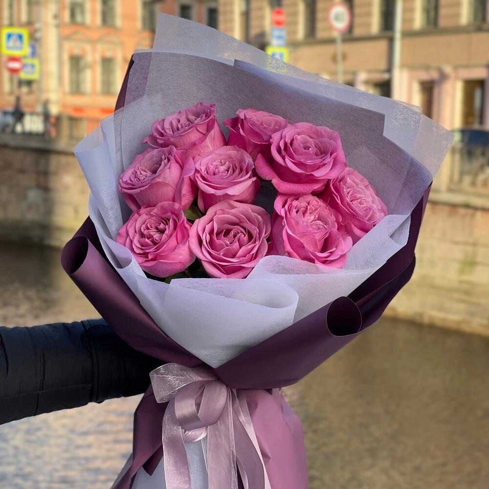 Лента – 2 шт.Роза одноголовая – 9 шт.Упаковка дизайнерская – 2 шт.