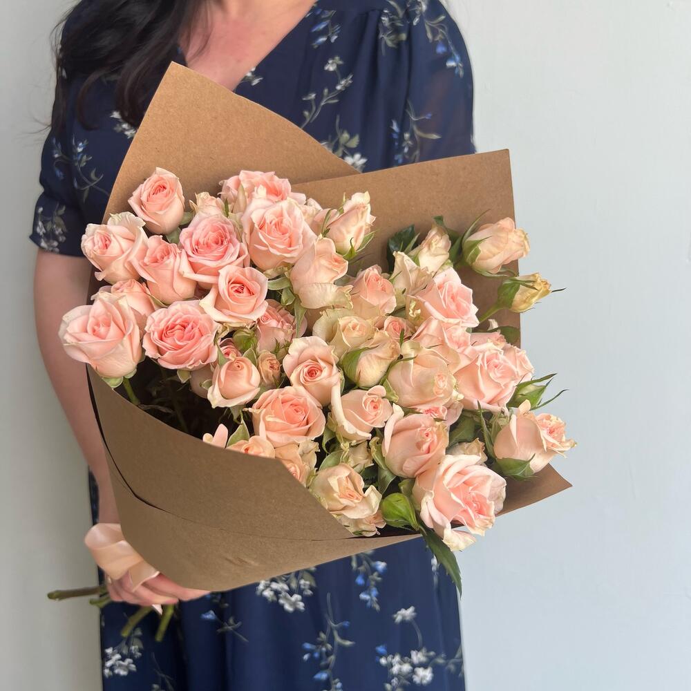 Кустовая роза – 9 шт.Лента атласная – 1 шт.Крафт упаковка – 2 шт.