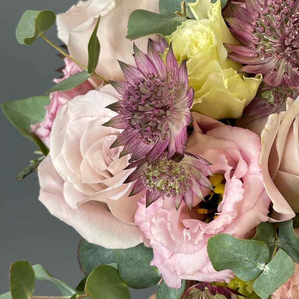 Лента – 2 шт.Лизиантус – 2 шт.Эвкалипт – 2 шт.Роза одноголовая – 5 шт.Астранция – 3 шт.Транспортировочная коробка – 1 шт.