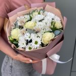 Букет Нежное прикосновение с белыми розами и хризантемами