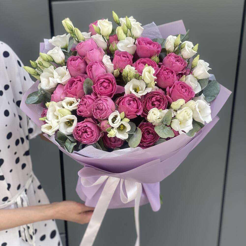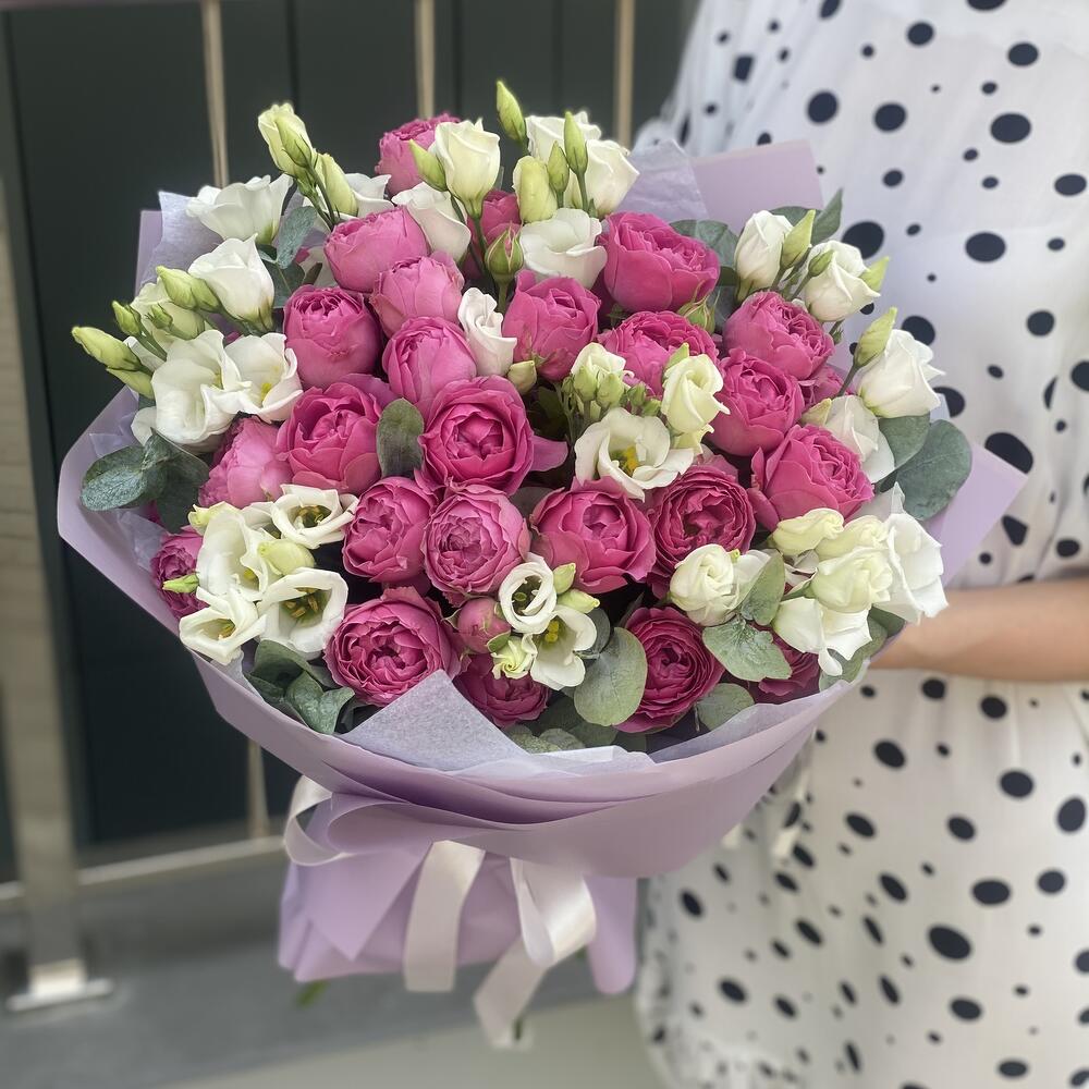 Букет из кустовых пионовидных роз, белой классической эустомы и эвкалипта в оформлении!