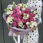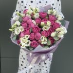 Эвкалипт – 2 шт. Оформление – 1 шт. эустома белая – 6 шт. кустовая пионовидная роза misty bubbles – 8 шт.