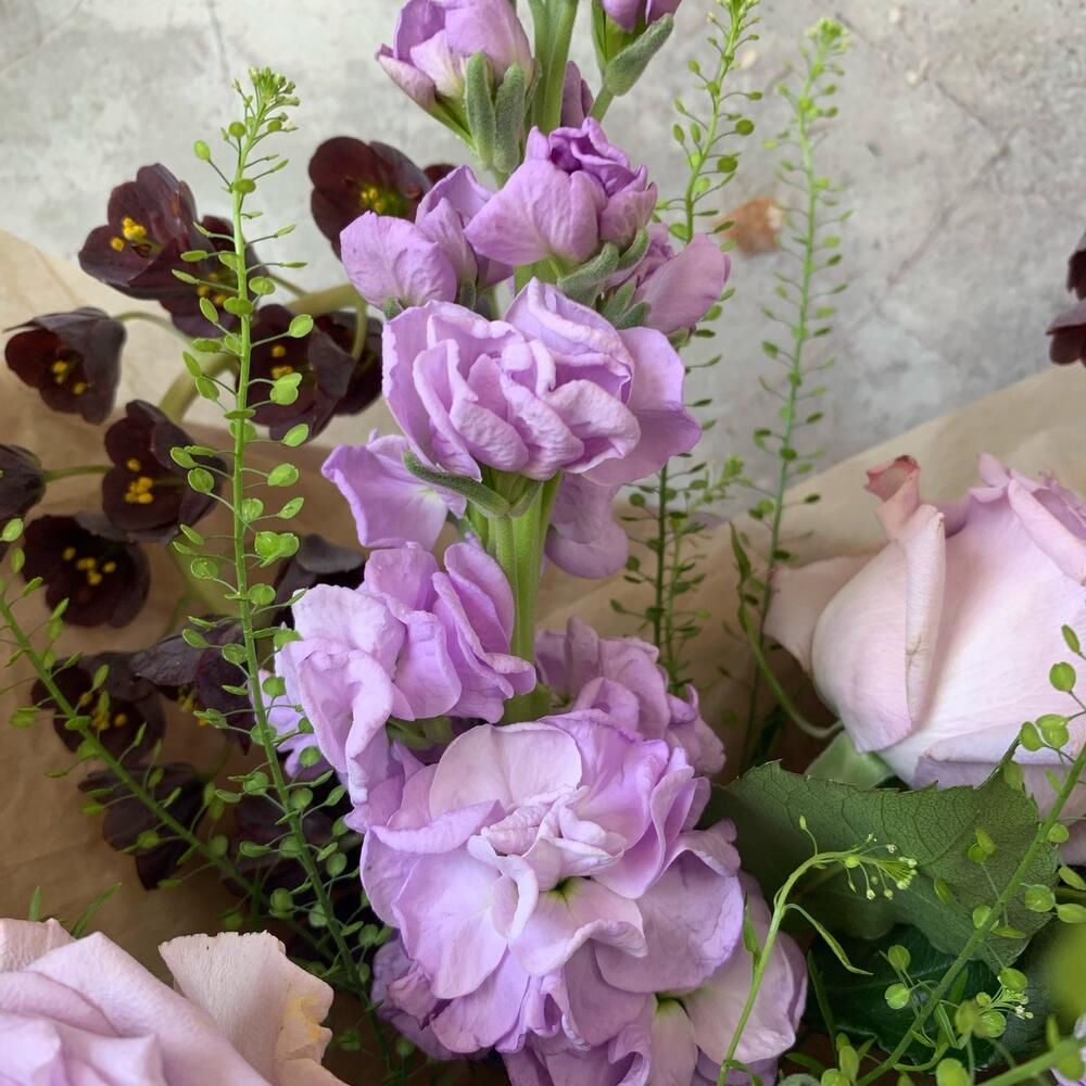 Роза оушен сонг – 5 шт.Фритиллярия – 3 шт.Таласпи – 1 шт.Маттиола – 2 шт.Упаковка дизайнерская – 1 шт.