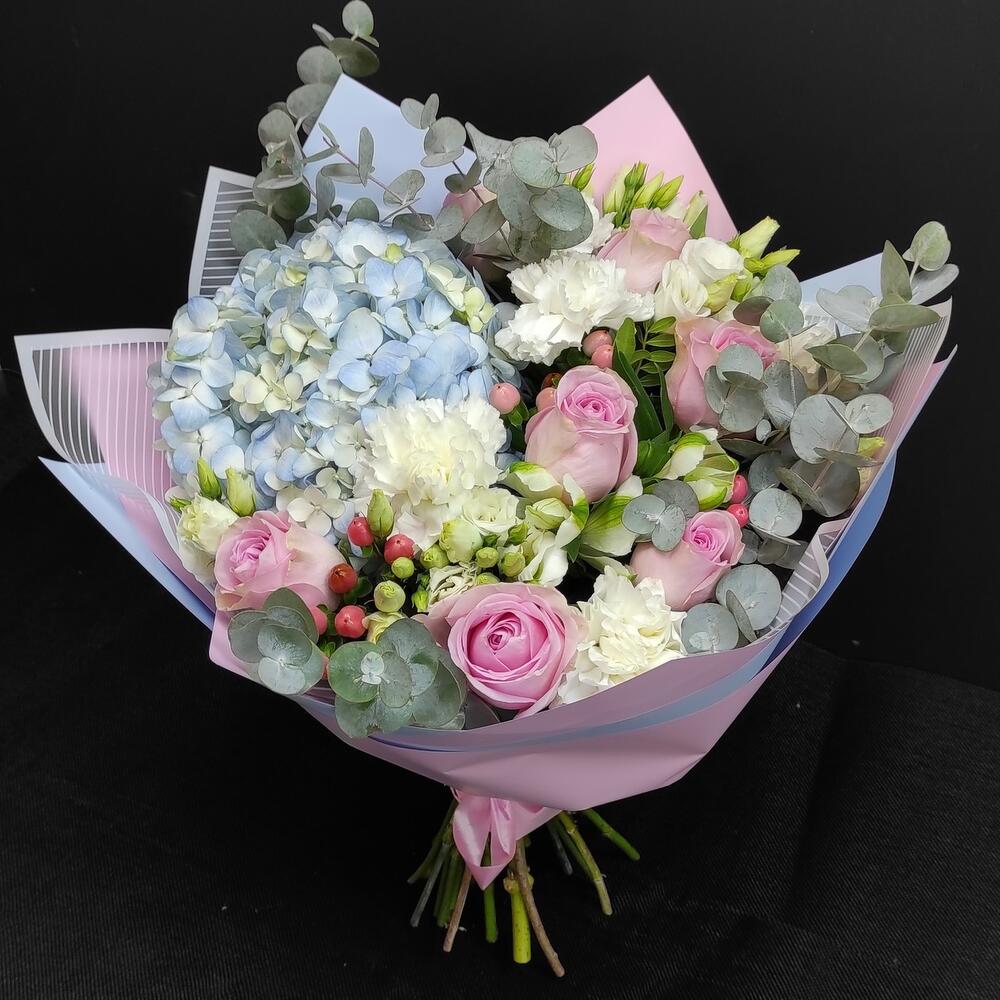 Букет с гортензией, розой Мондиаль и эустомой "Нежные нотки"