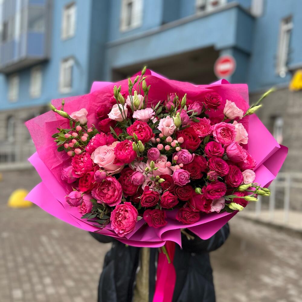 Букет с пионовидными розами,эустомой и гиперикумом