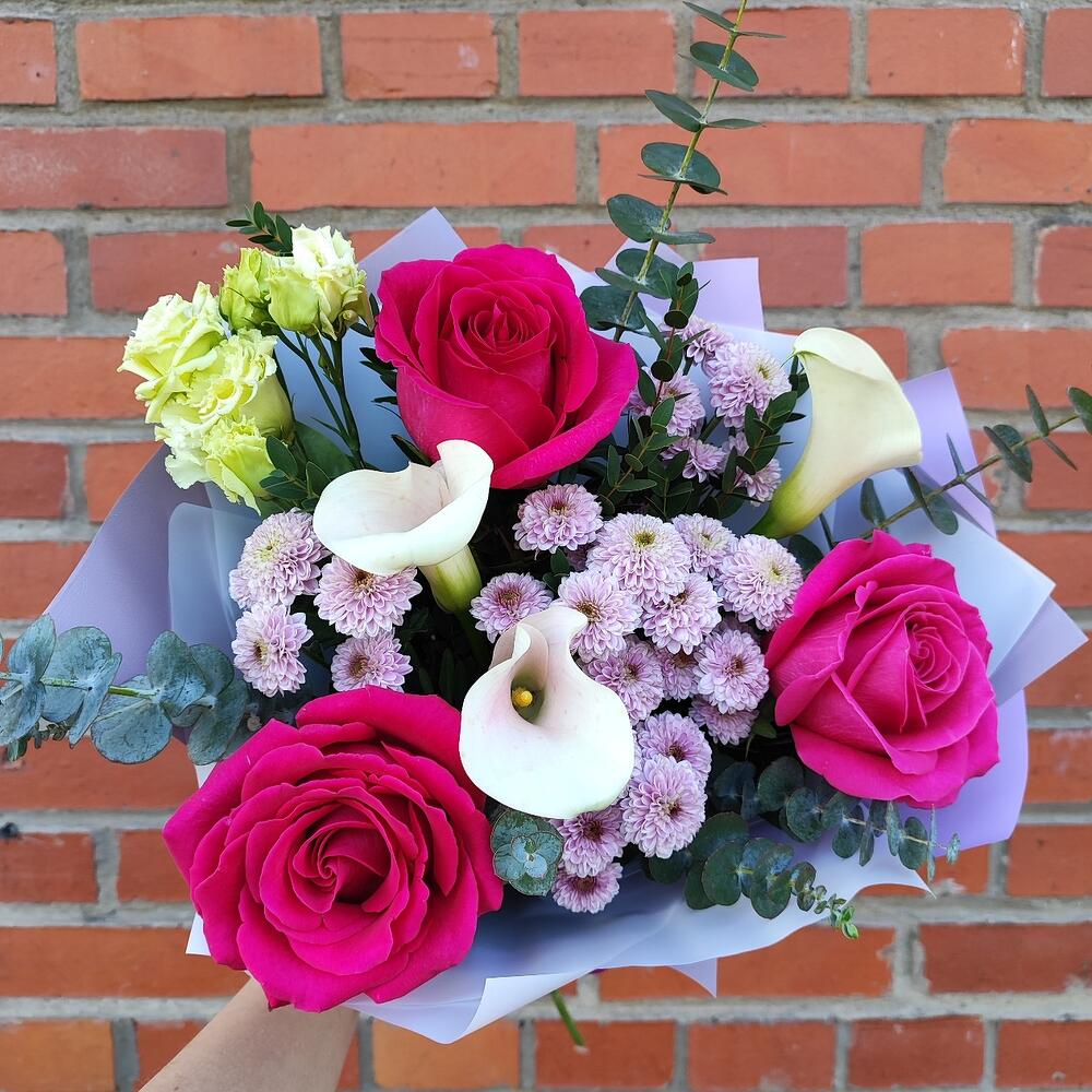 Роза эквадор Pink Floyd – 3 шт.Калла белая – 3 шт.Лизиантус – 1 шт.Хризантема Сантини – 5 шт.Эвкалипт пучок – 1 шт.Фисташка пучок – 1 шт.Упаковка дизайнерская – 1 шт.