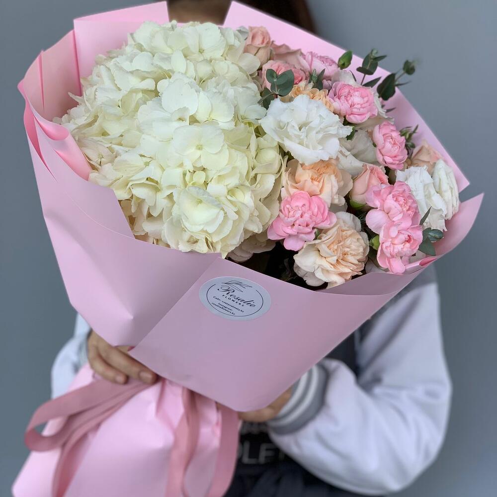 Альстромерии, Гортензии, Кустовые розы, Лизиантусы, Розы, Хризантемы
