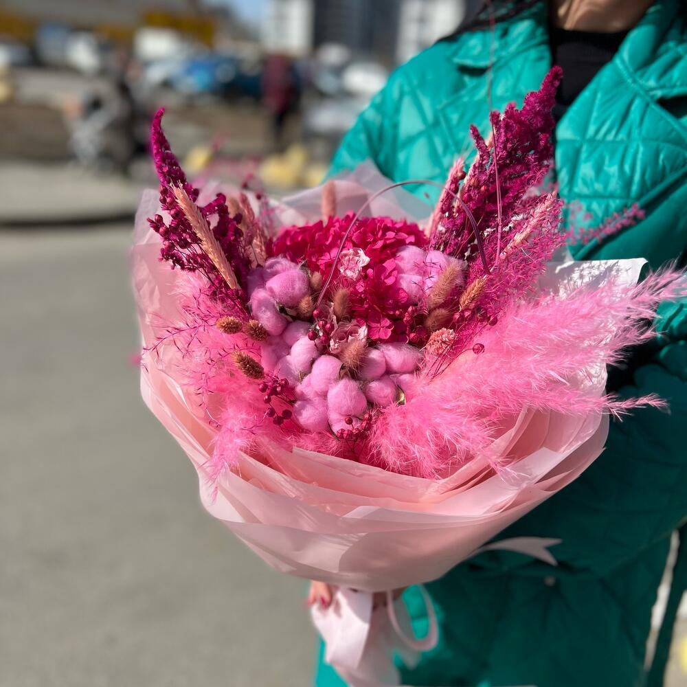 Лента атласная – 1 шт.Упаковка дизайнерская – 7 шт.Роза стабилизированная – 3 шт.Лагурус (сухоцвет) – 8 шт.Пшеница (сухоцвет) – 5 шт.Хлопок (сухоцвет) – 5 шт.овес сухоцвет – 9 шт.фаларис сухоцвет – 6 шт.кортадерия – 3 шт.гортензия розовая стабилизированная – 1 шт.мискантус розовый – 2 шт.солидаго стабилизированный – 2 шт.