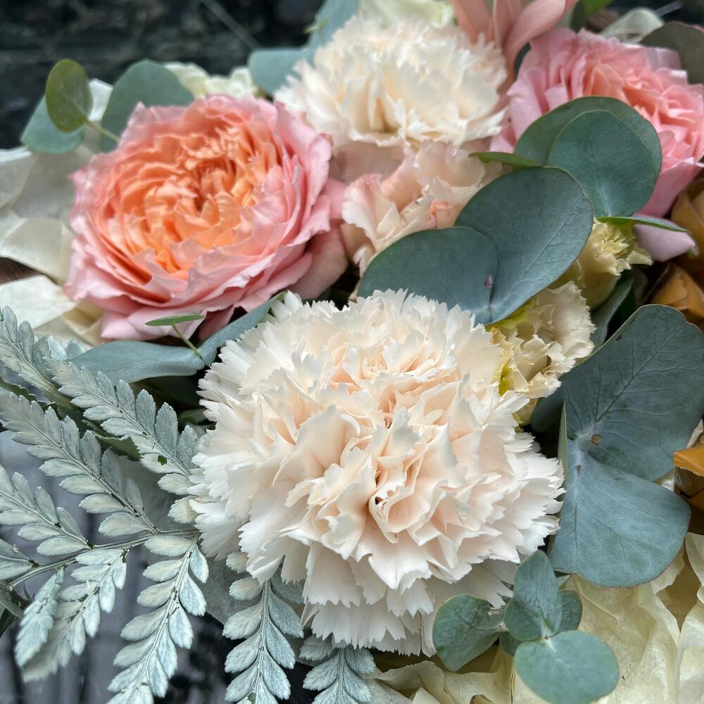 Роза кустовая пионовидная – 1 шт.Диантус – 2 шт.Лизиантус – 1 шт.Папоротник – 2 шт.Лента – 2 шт.Упаковка дизайнерская – 2 шт.