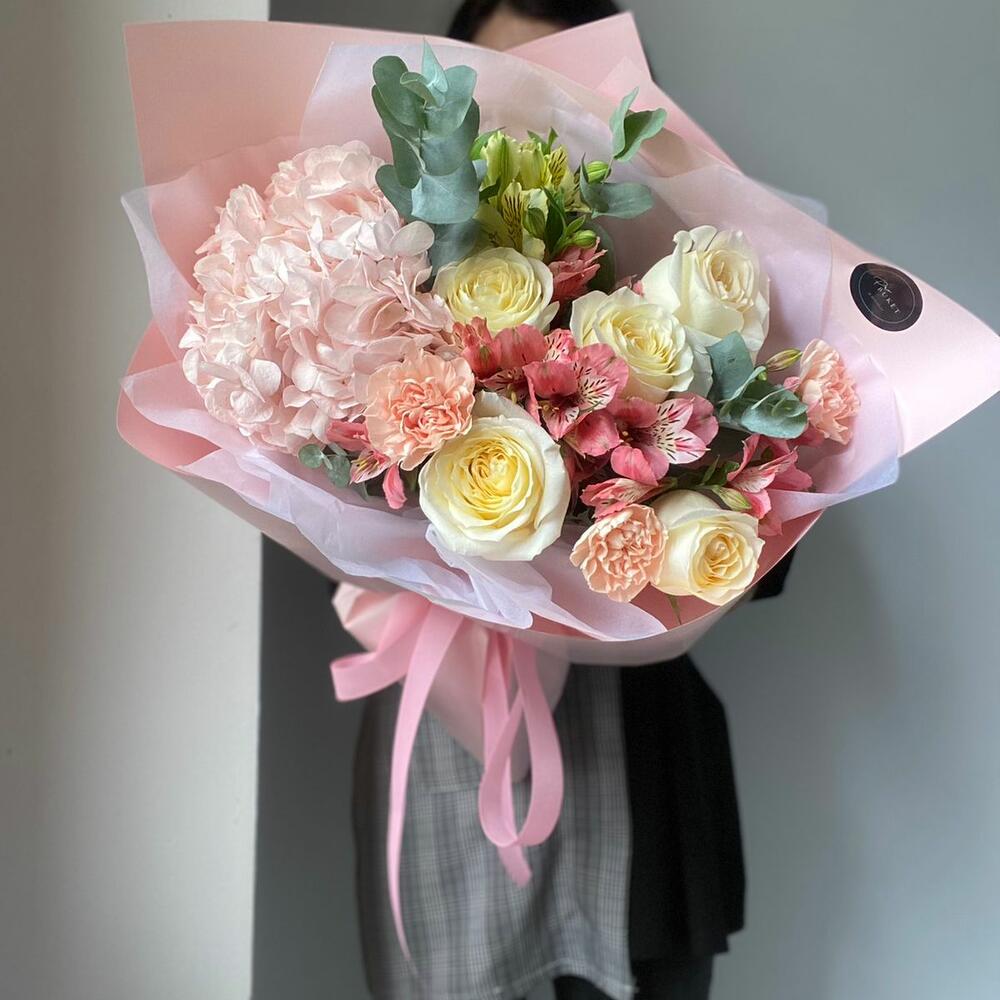Альстромерии, Гортензии, Кустовые розы, Лизиантусы, Розы, Хризантемы