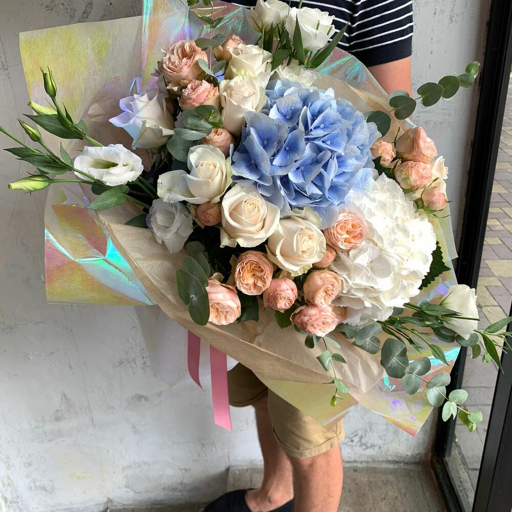 Альстромерии, Гвоздики, Кустовые розы, Лизиантусы, Розы, Хризантемы