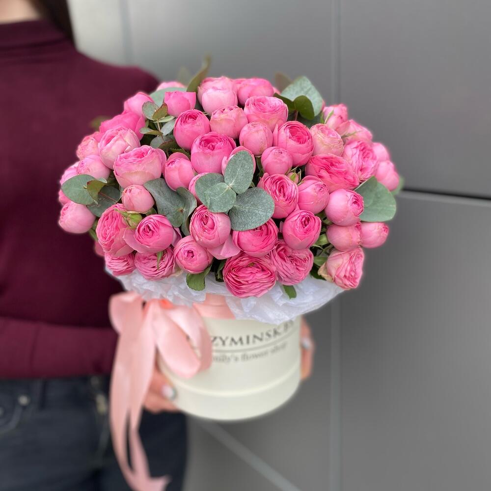 Коробка шляпная – 1 шт. Пионовидная кустовая роза – 11 шт. Губка флористическая – 1 шт.
