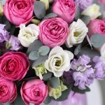 Ароматная маттиола, пионовидные кустовые розы, эустома и эвкалипт в стильной шляпной коробке. Композиция собрана на флористической губке, пропитанной водой. Такому подарку не нужна ваза, уход очень прост, нужно подливать воду в центр композиции, между цветами, раз в день, примерно 100мл воды