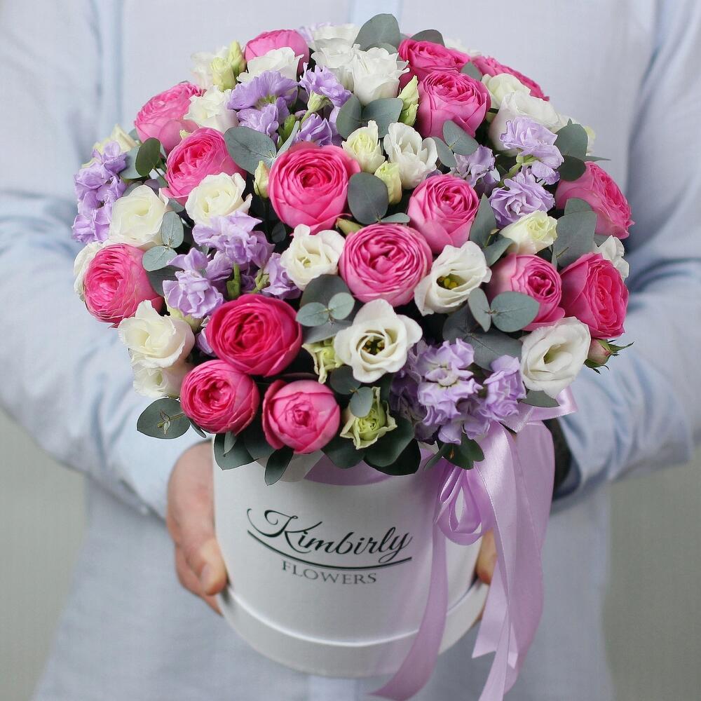 Цветы в шляпной коробке. Пионовидные кустовые розы Сильва пинк, эустома, маттиола. Букет 213 Kimbirly Flowers