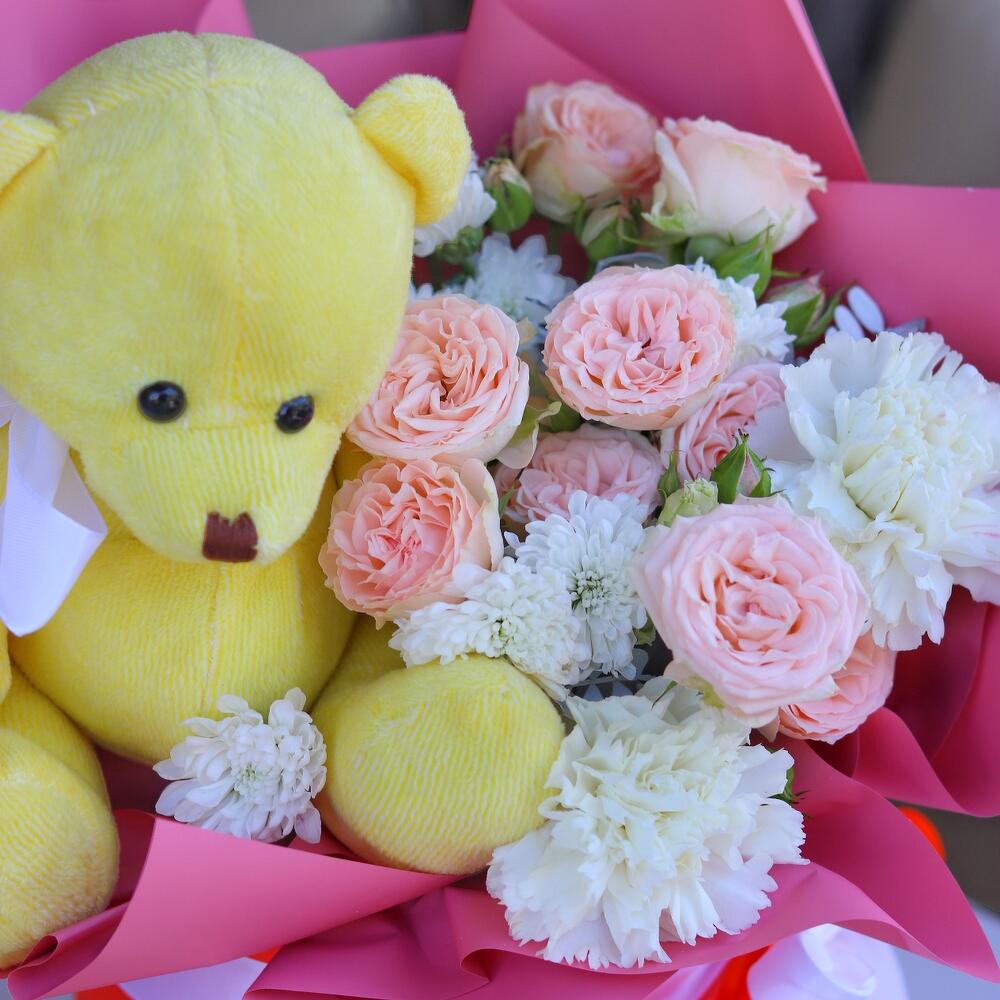 Яркая, насыщенная и воздушная композиция с мишкой, выполненная из стокйих цветов: кустовой розы, сантини и диантусов.Такая композиция точно понравится яркой и энергичной получательнице, и будет долго радовать её.К композиции прилагается открытка с вашими пожеланиями и приятный комплимент от нашего магазина – шоколадка.Мы также будем рады отправить вместе с композицией конфеты, шоколад ручной работы или б/а вино по вашим пожеланиям, просто напишите нам в личные сообщения. Заказывая нашу композицию, Вы всегда получите исключительный сервис и заботу о клиенте
