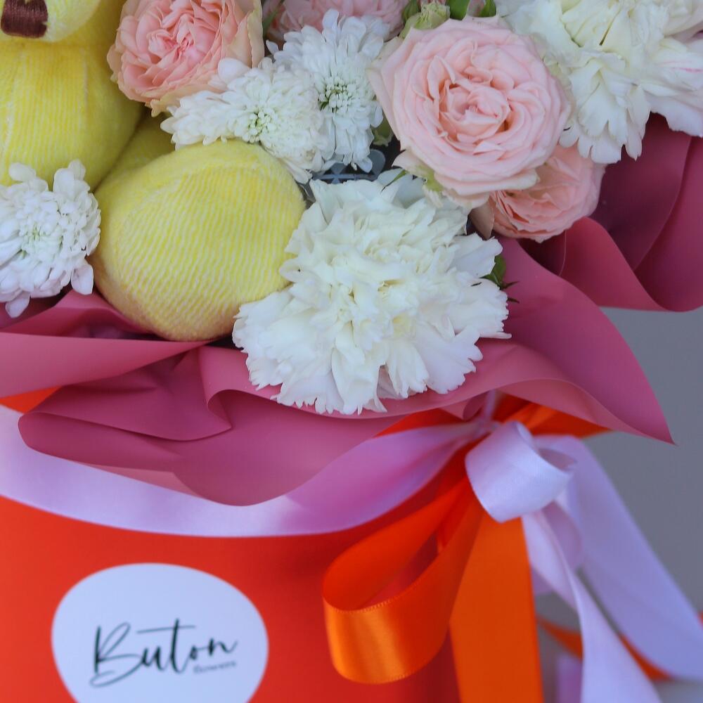 Цветы в яркой коробке с мишкой