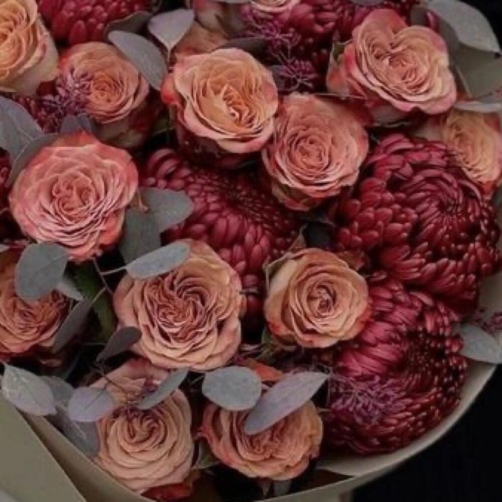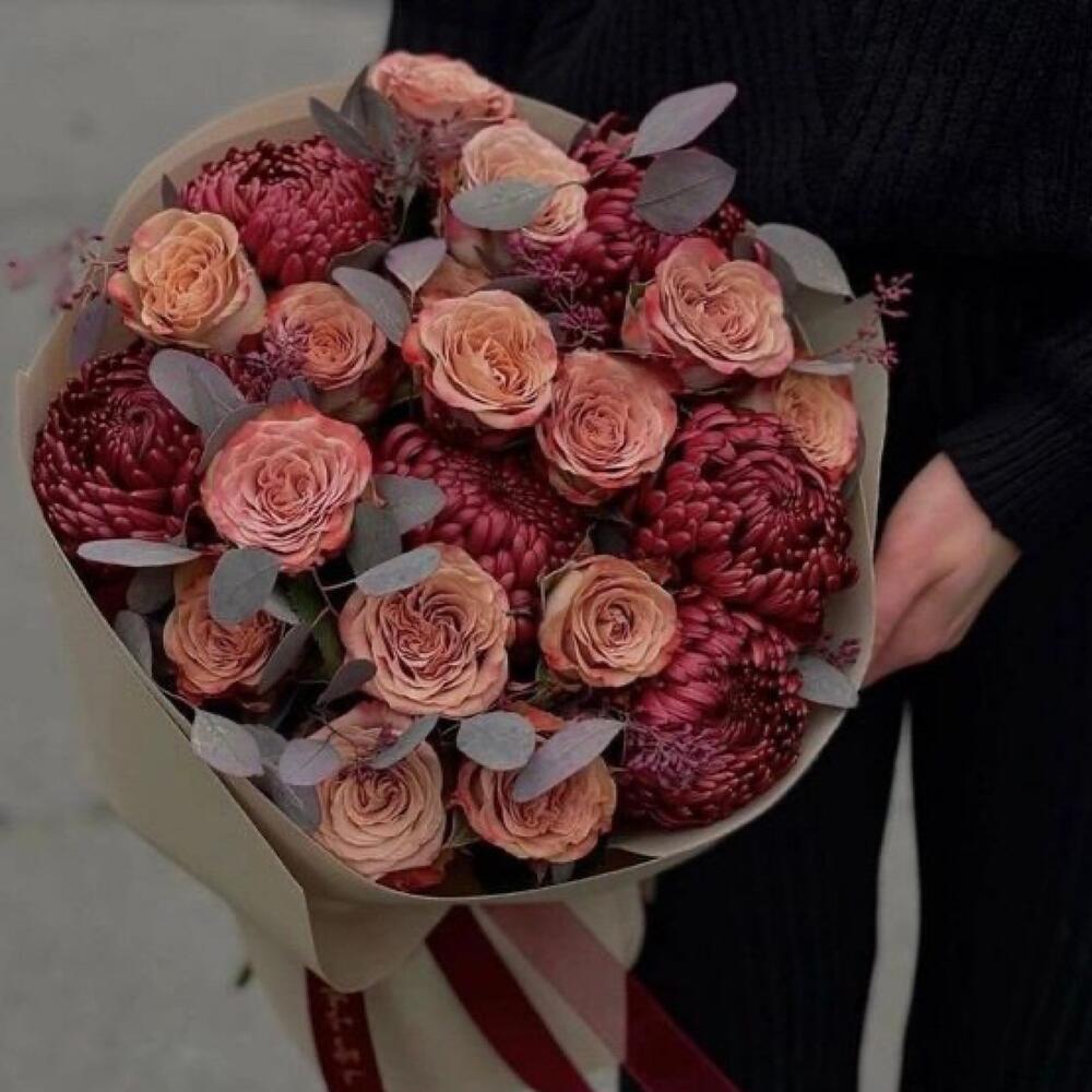 Альстромерии, Гвоздики, Кустовые розы, Лизиантусы, Розы, Хризантемы