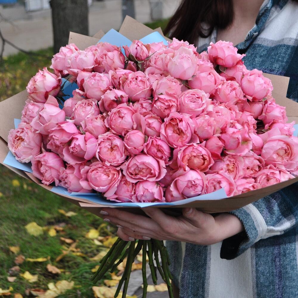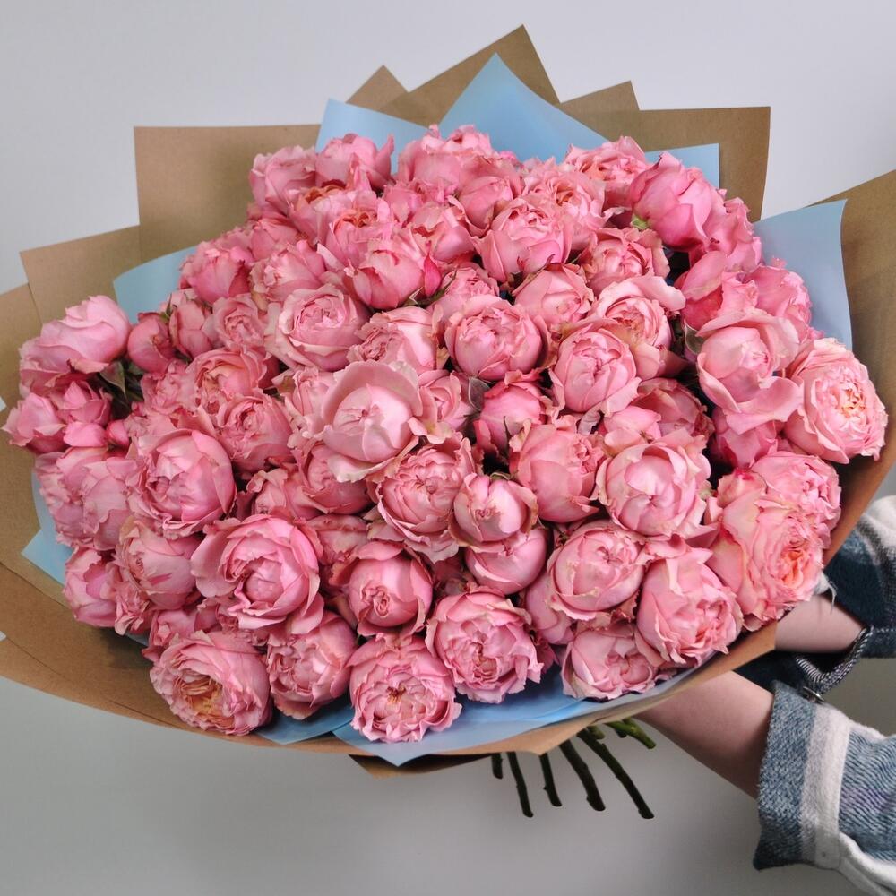 Роза кустовая пионовидная – 21 шт.Пленка матовая – 2 шт.Крафт – 2 шт.Лента атласная – 1 шт.