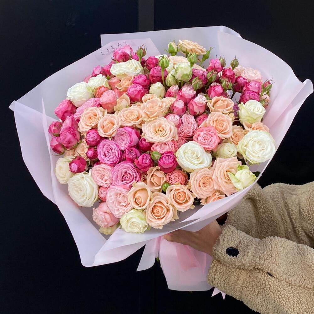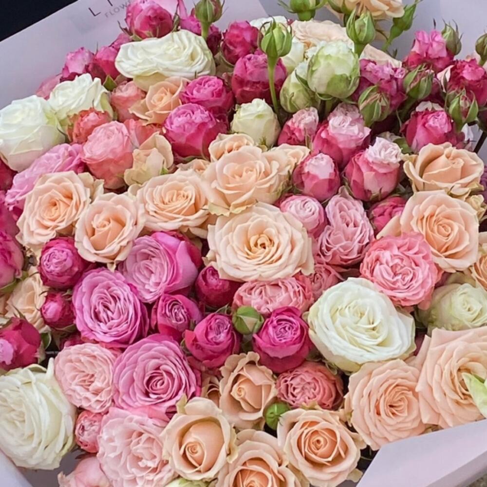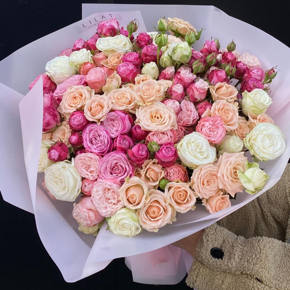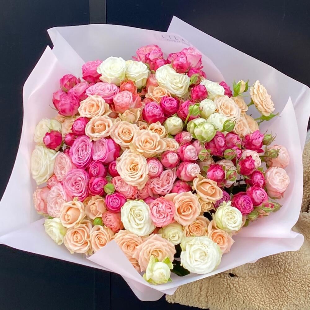 Упаковка дизайнерская – 3 шт. Пионовидная кустовая роза – 17 шт. Открыточка с вашими пожеланиями – 1 шт. доставка – 1 шт.