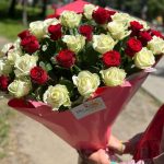 Игривый букет из 51 красных и белых роз с оформлением как бы намекают, что пора двигаться дальше в отношениях. А если ещё написать пару строк в открытке – то успех гарантирован )
