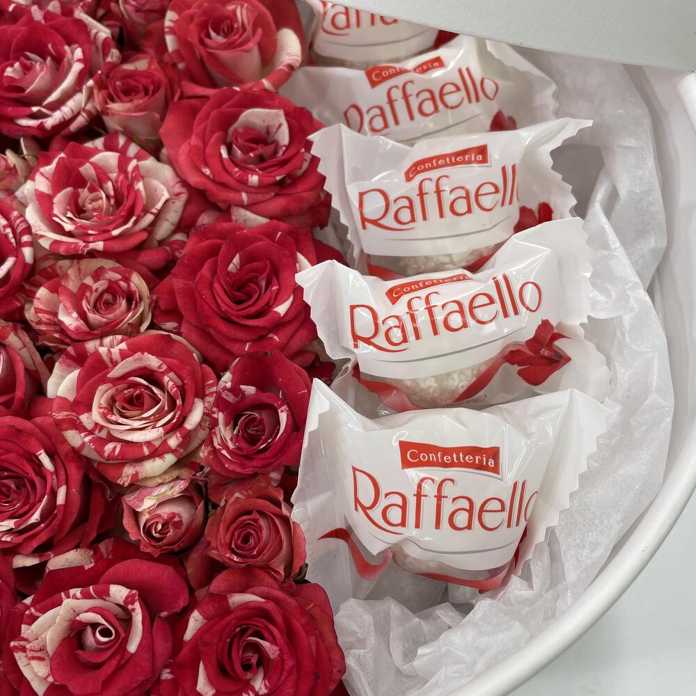 Роза кустовая – 3 шт.цилиндр плоский 21 см – 1 шт.Оазис флористический – 1 шт.Раффаэлло – 5 шт.