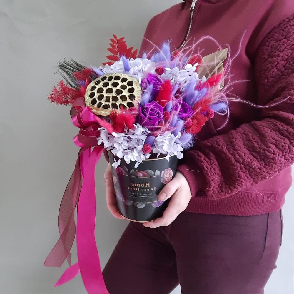 Композиция с лавандой, лагурусом и стабилизированной гортензией
