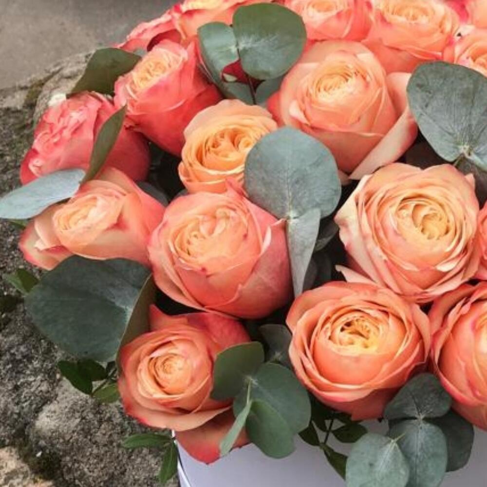 Эвкалипт – 9 шт.Коробка шляпная – 1 шт.Роза пионовидная кахала – 25 шт.