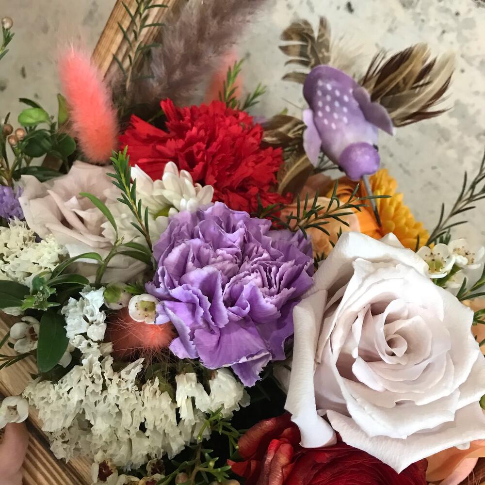 Ваксфлауэр – 2 шт.Статица – 3 шт.Хризантема кустовая – 1 шт.Роза – 5 шт.Гвоздика – 2 шт.Гербера – 1 шт.Ранункулюс – 1 шт.Птица декоративная – 1 шт.Ящик деревянный – 1 шт.фисташкв – 3 шт.декор трава – 5 шт.
