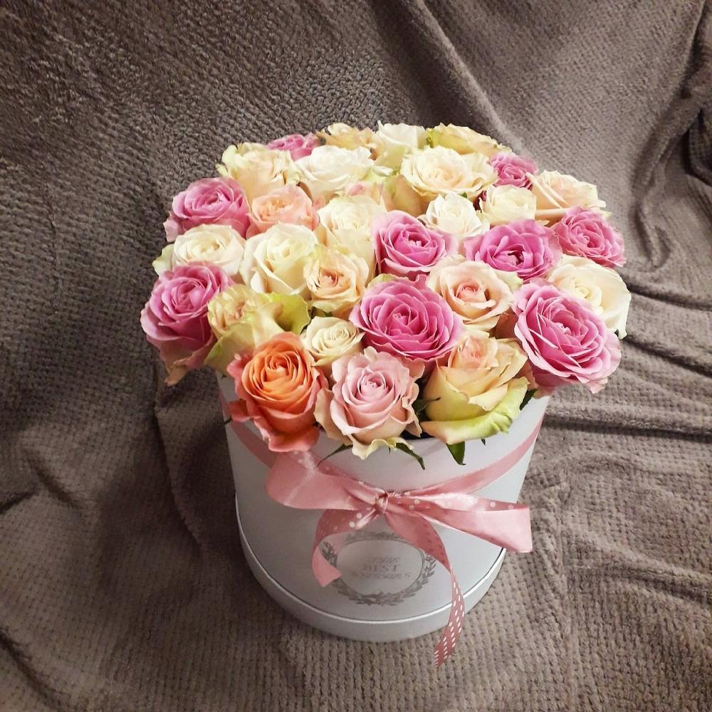 Коробка шляпная – 1 шт.Роза – 31 шт.Оазис флористический – 1 шт.