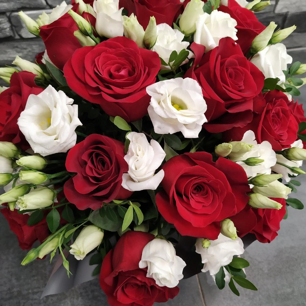 Роза Эквадор – 19 шт.Лизиантус Алиса белый – 5 шт.зелень декоративная – 10 шт.Коробка шляпная – 1 шт.Оазис флористический – 1 шт.