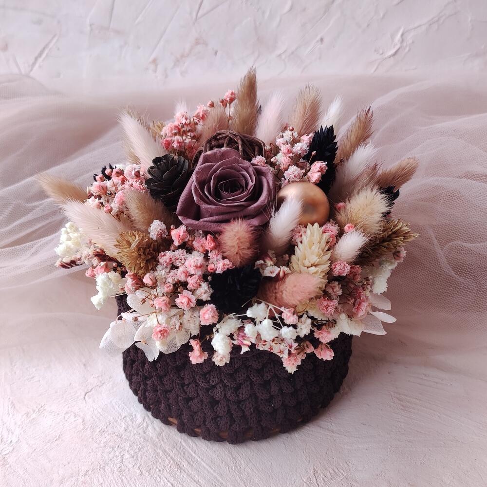 Гипсофила – 5 шт.Лимониум – 1 шт.Роза стабилизированная – 1 шт.Лагурус – 20 шт.фаларис сухоцвет – 15 шт.корзина вязаная ручной работы – 1 шт.