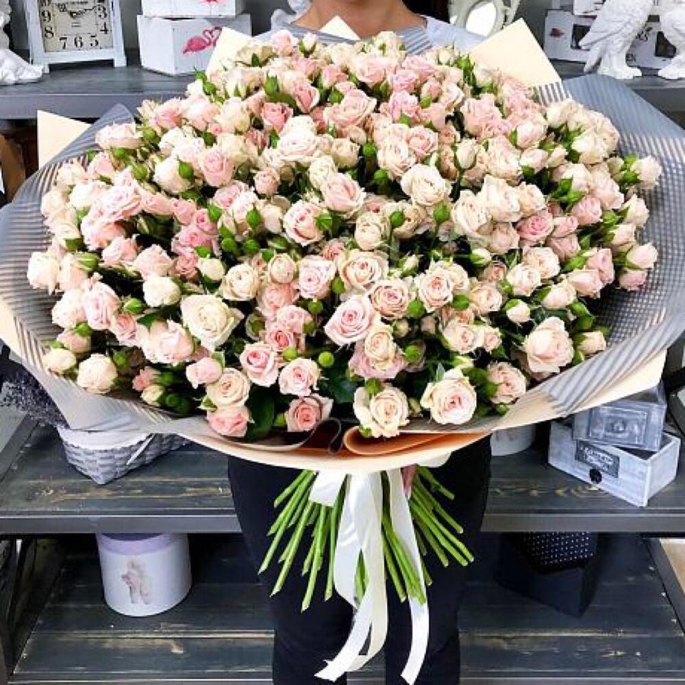 Лента атласная – 3 шт. Роза кустовая розовая – 51 шт. Упаковка дизайнерская – 5 шт.
