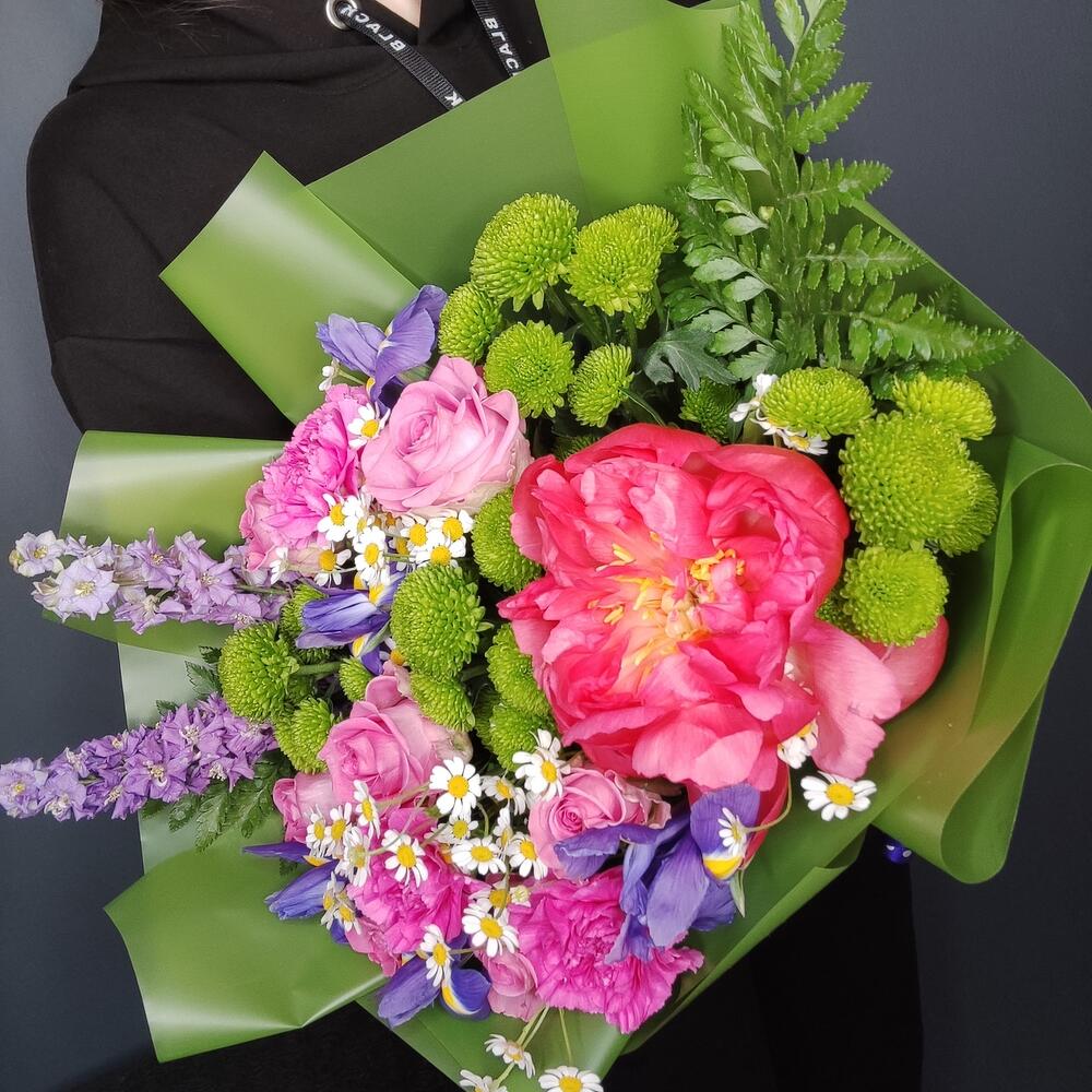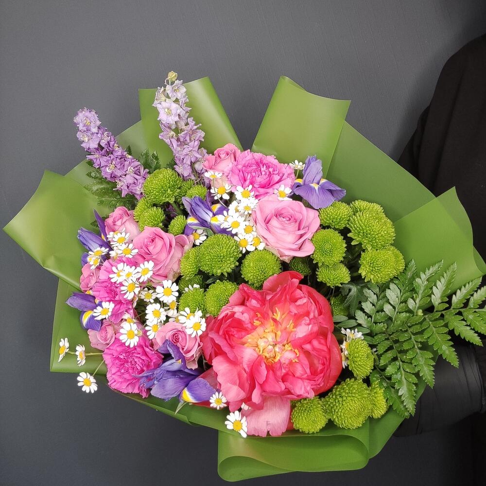 Пион – 1 шт.Ирис – 5 шт.Дельфиниум – 2 шт.Матрикария – 3 шт.Роза – 7 шт.Сантини – 4 шт.Гвоздика – 3 шт.Фисташка – 3 шт.Папоротник – 2 шт.Упаковка дизайнерская – 3 шт.