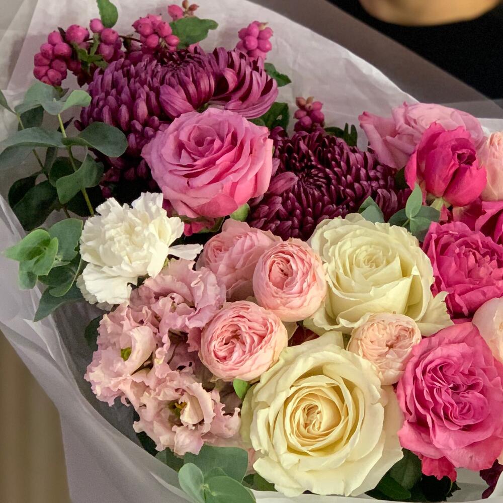 Категорий: Гвоздики, Лизиантусы, Пионовидные розы, Розы, Хризантемы