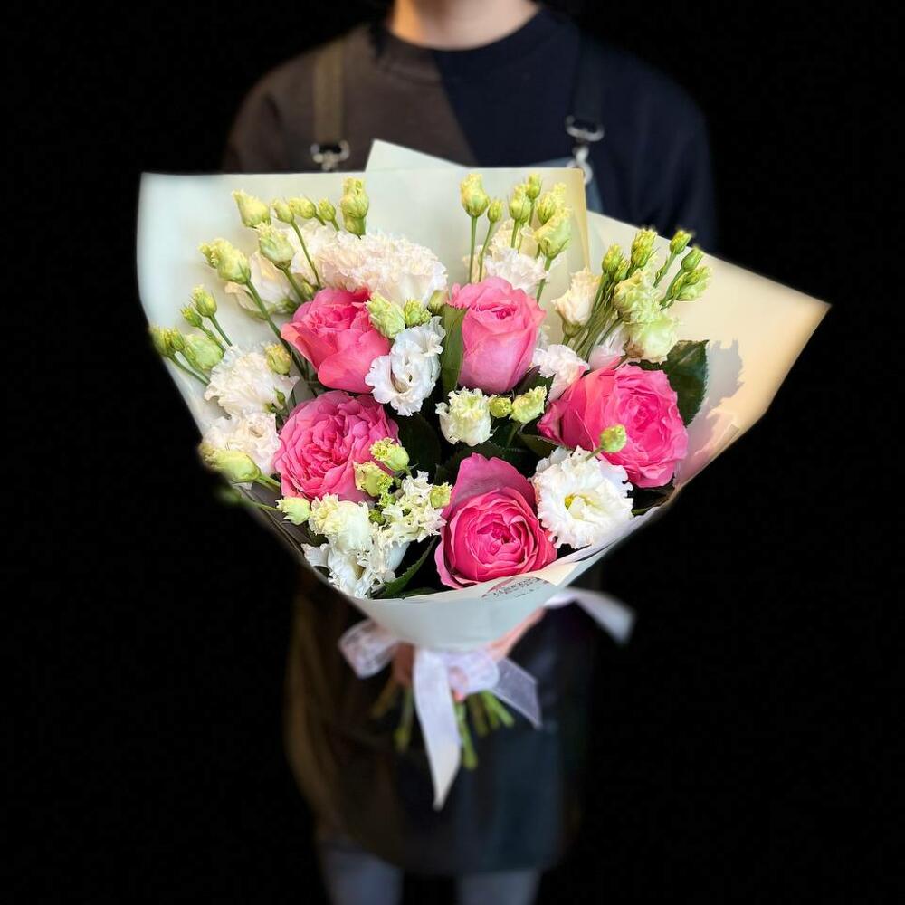 Роза розовая Эквадор – 5 шт.Эустома – 4 шт.