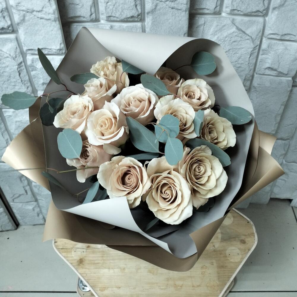 Лента атласная – 1 шт.Упаковка дизайнерская – 2 шт.Роза эквадор 40 см – 13 шт.Эвкалипт Микс – 2 шт.