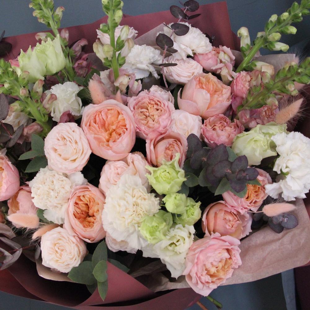 Роза пионовидная кустовая – 5 шт.Роза пионовидная – 3 шт.Львиный зев – 5 шт.Эвкалипт – 5 шт.Диантус – 7 шт.Фисташка – 3 шт.Лизиантус – 4 шт.Тишью – 3 шт.Бумага – 3 шт.Лента атласная – 2 шт.Лагурус – 15 шт.