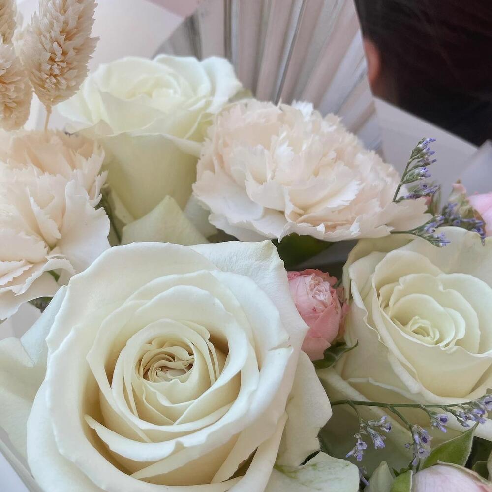 Роза белая – 5 шт.гвоздика brut – 3 шт.Роза кустовая bombastic – 2 шт.Лимониум синий – 2 шт.пальмовый лист – 1 шт.Упаковка – 1 шт.