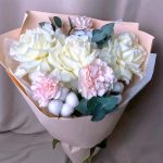 Пышный авторский букет из французской белой розы, розового диантуса и эвкалипта