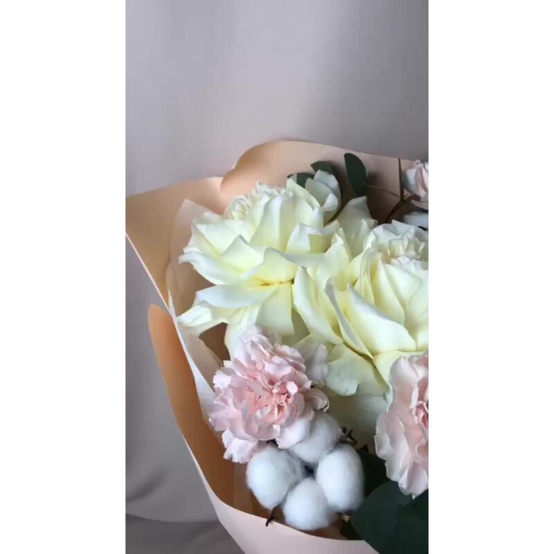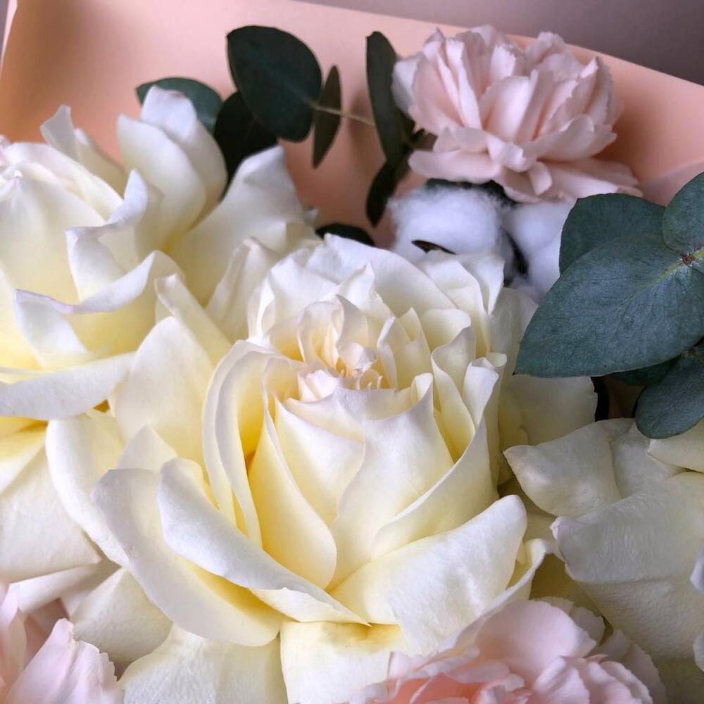 Хлопок – 3 шт.Эвкалипт – 3 шт.Гвоздика – 3 шт.Лента атласная – 1 шт.флористическая пленка – 1 шт.роза французская белая – 3 шт.подкормка для стойкости цветов – 1 шт.открытка для пожеланий – 1 шт.