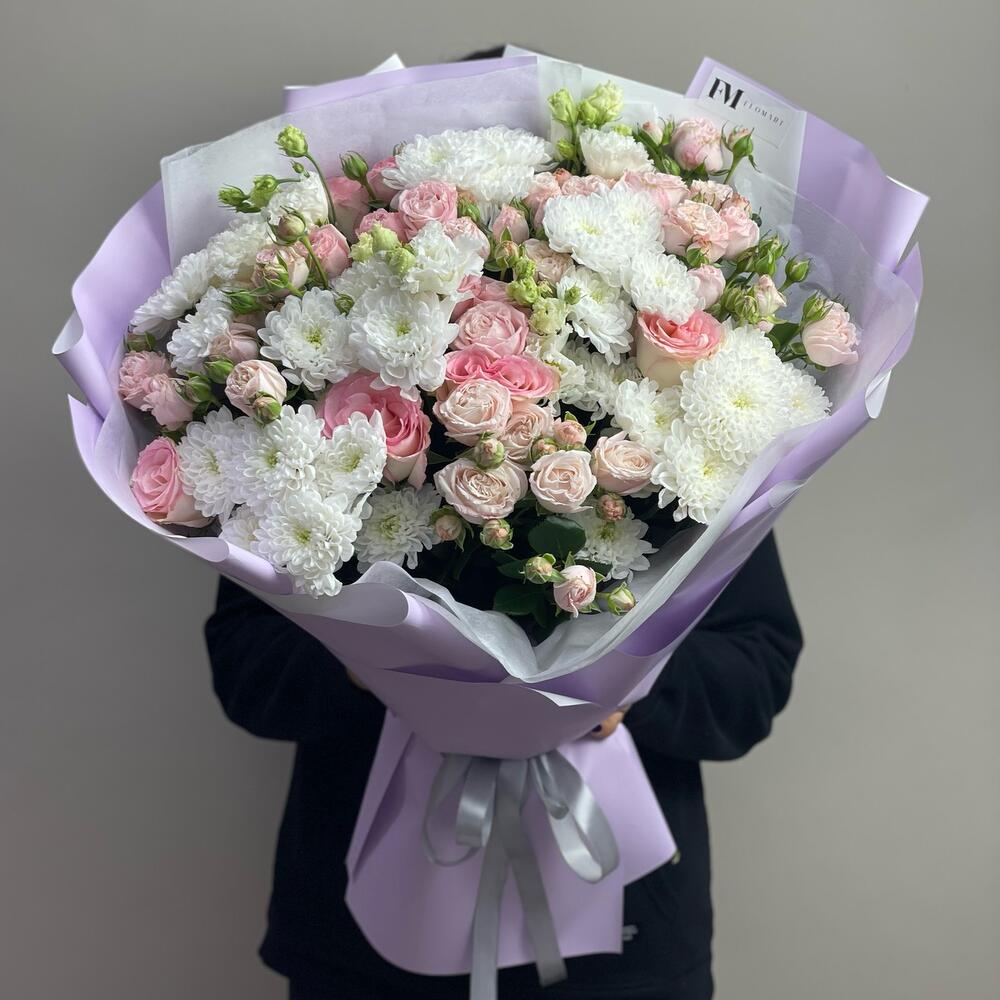Альстромерии, Гвоздики, Кустовые розы, Лизиантусы, Розы, Хризантемы