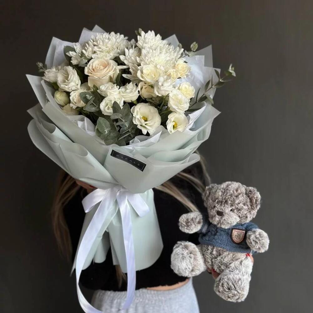 Хризантема кустовая – 3 шт. Спрей роза – 2 шт. Роза Голландская – 1 шт. Эвкалипт – 1 шт. Лизиантус – 1 шт. Мишка плюшевый – 1 шт.