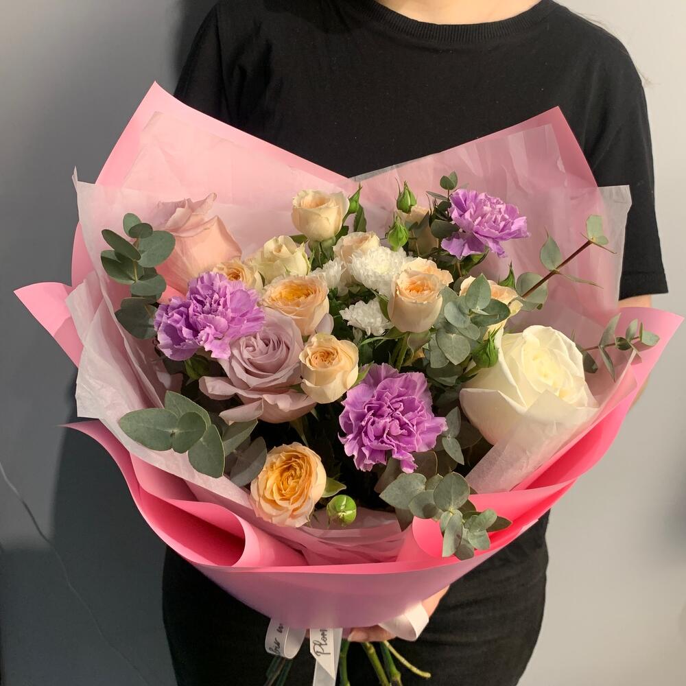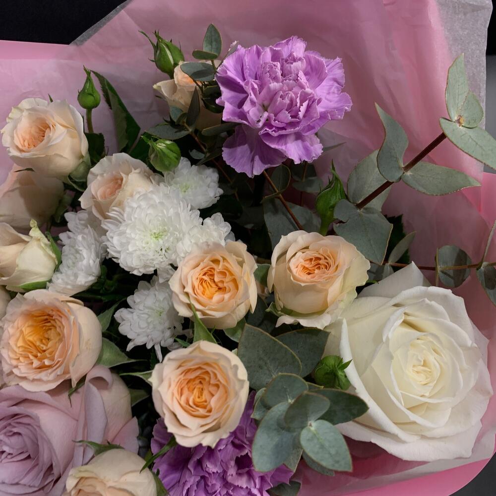 Альстромерии, Гвоздики, Кустовые розы, Лизиантусы, Розы, Хризантемы