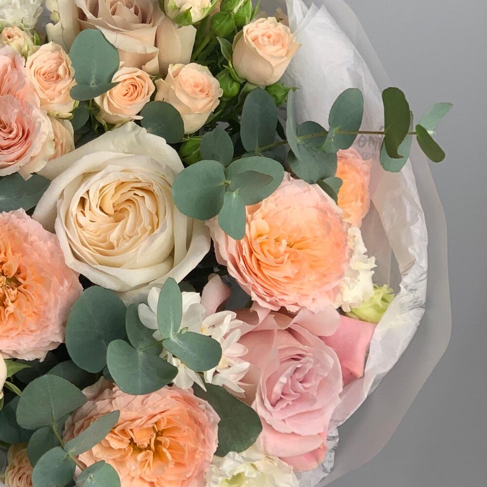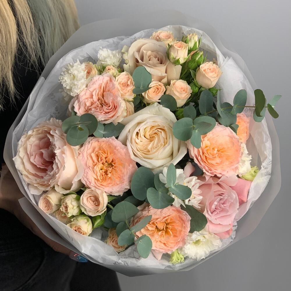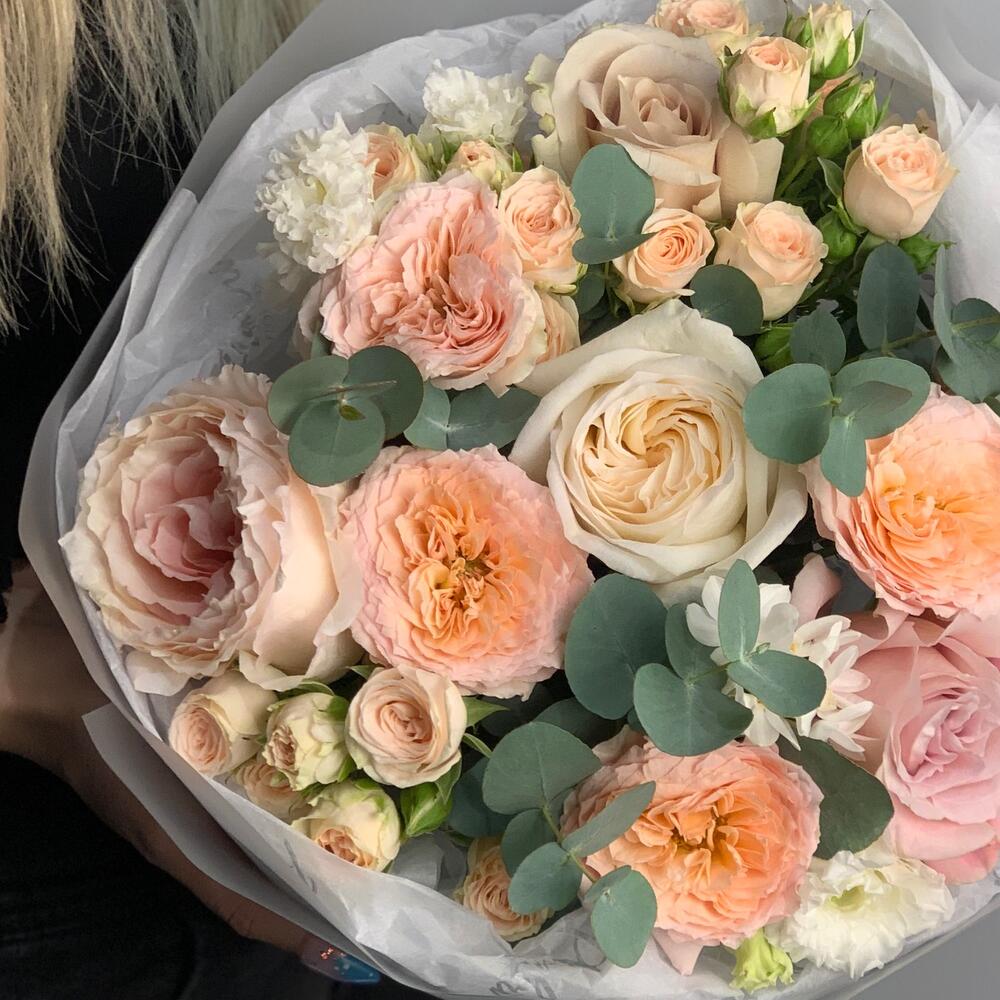 Гвоздики, Лизиантусы, Розы, Тюльпаны